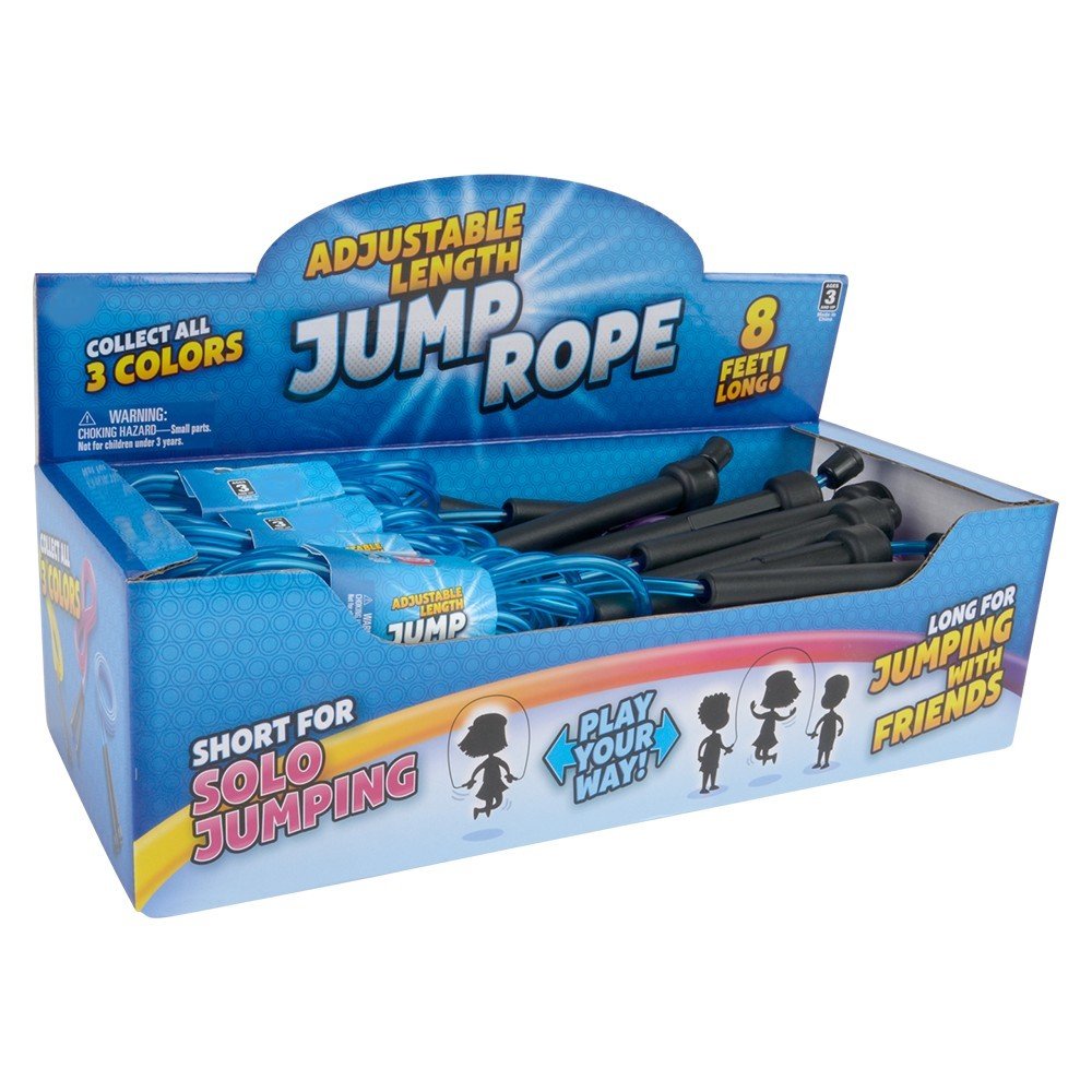 Adjustable Colourful Skipping Ropes. Easily adjust them for solo skipping or lengthen them out for long skipping with your friends. They are each up to 8 feet long. Assorted colours. Age 3+. Master case 144pcs. 12 Pc counter displays.
