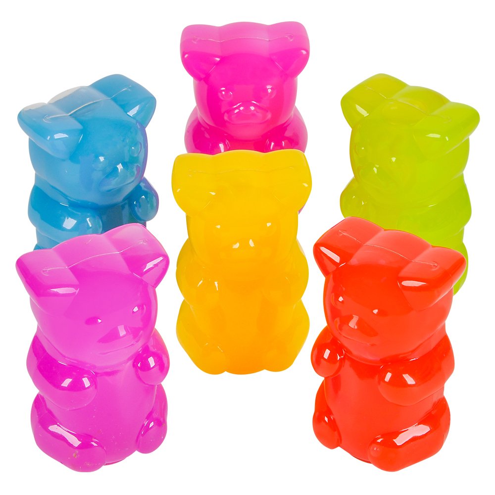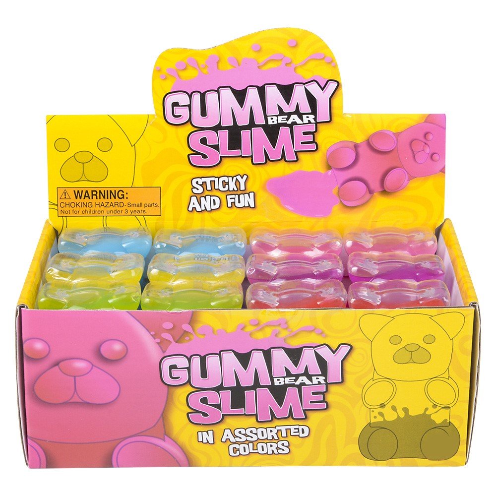 It’s Gummie Bear Slime Time. In Gummie Bear shaped containers, just pour out some slime and relieve your stress and have fun. Ages 3+. Master case 144pcs.