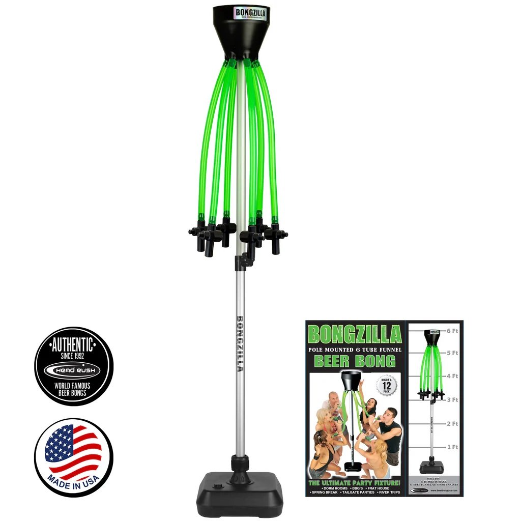 Introducing the “BongZilla”, The MONSTER of all Beer Bongs and a Head Rush Exclusive! A 6 Tube Pole Mounted Beer Bong! The Ultimate Party Fixture. This Beer Bong Screams “LET’S PARTY”. Awesome for Tailgate parties, Dorms, Stag and Does, River and regular Camping, Festivals, backyard get togethers…anywhere some serious fun is supposed to take place! BongZilla must be there! This bong includes Six 36″ long thick gauge “always flexible” Hoses that Include easy to use Shut Off Valves and a super capacity Funnel that holds a whole 12 Pack!