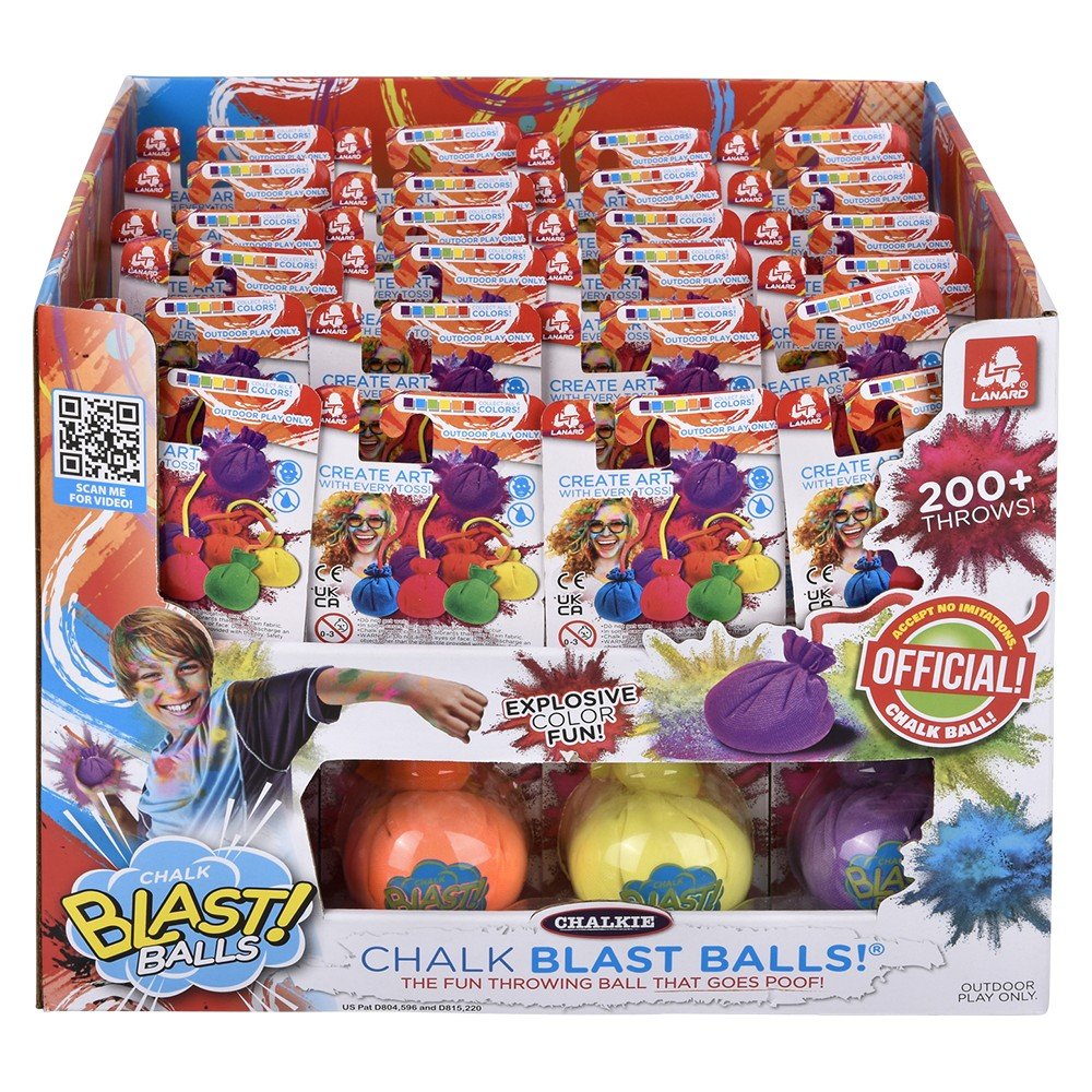 Get Outside and Play!!! “The Fun Throwing Ball That Goes Poof”. These Lanard Official Chalkie Balls are a blast! Kind of like paintball…..but safer… these balls are filled with colourful chalk. Each ball has a single chalk colour. Chase your opponent around the house, through the trees, duck and hide… if your chalkie ball makes contact it will leave a chalk mark on your target. Create a Bulls eye target and stand back and see who can hit a bulls eye. Lots of ways to play. Keep track of your score. Each Chalkie Ball packs around 200 throws before the chalk runs out. Each counter PDQ display holds 48 individually packed chalkie balls. Great sell through as all the kids friends or family will want a few. Chalk easily washes out. Age 6+. Master 48pcs.