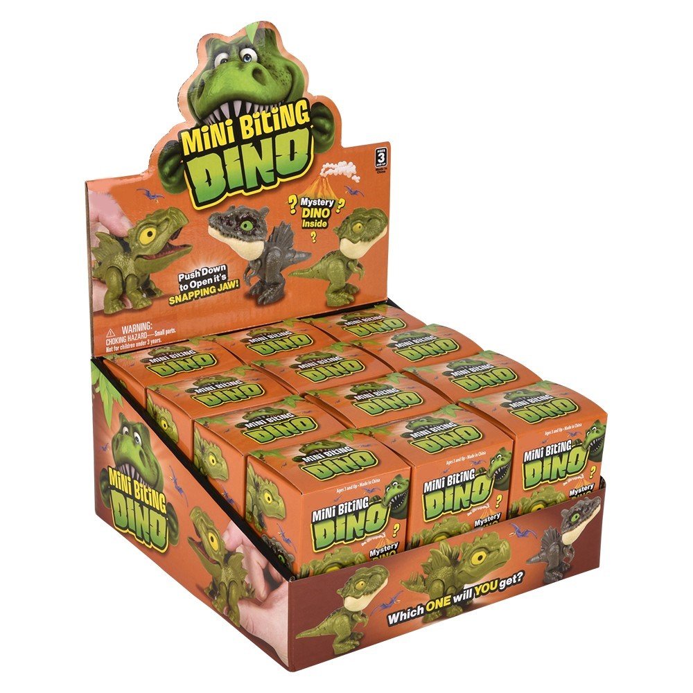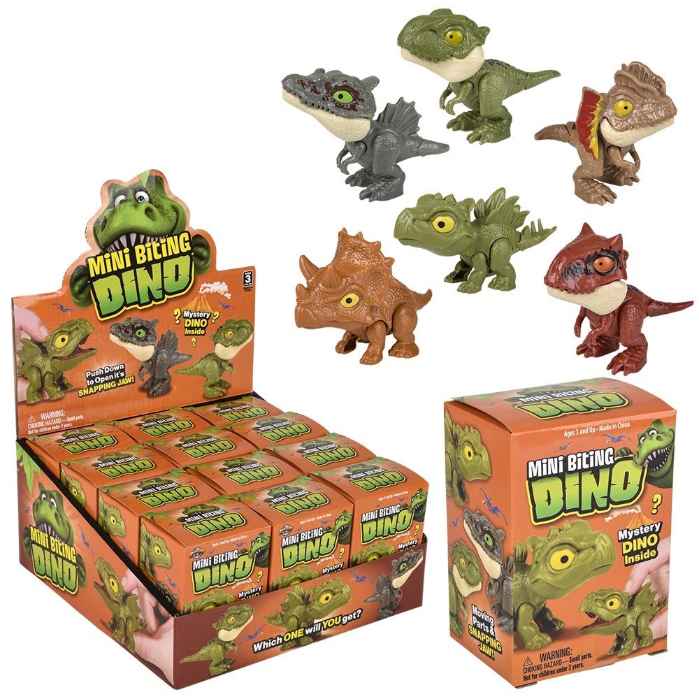 These cute and realistic looking 2.5″ tall assorted Dinosaurs stand up on a surface and when you pick them up, squeeze the back of their spring loaded necks and their Jaws will bite down on your unsuspecting victim when you release your finger. Don’t worry these little dinos will not draw blood. Sold in mystery boxes, you never know what one your going to get inside. Collect them all. Trade with your friends. Age 3+. Master case 96 pcs. Sold in a 12pc. counter display.