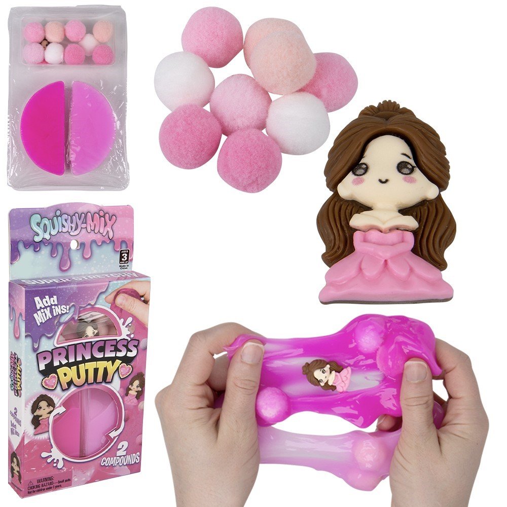 This Dual two part putty compound comes with a cute princess figurine and a number of add in mix items. Each individually packaged. Age 3+. Master Case 72pcs.