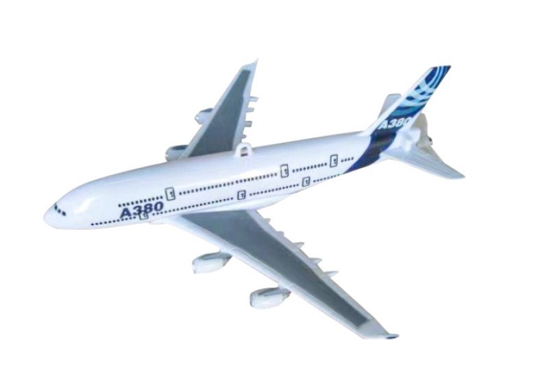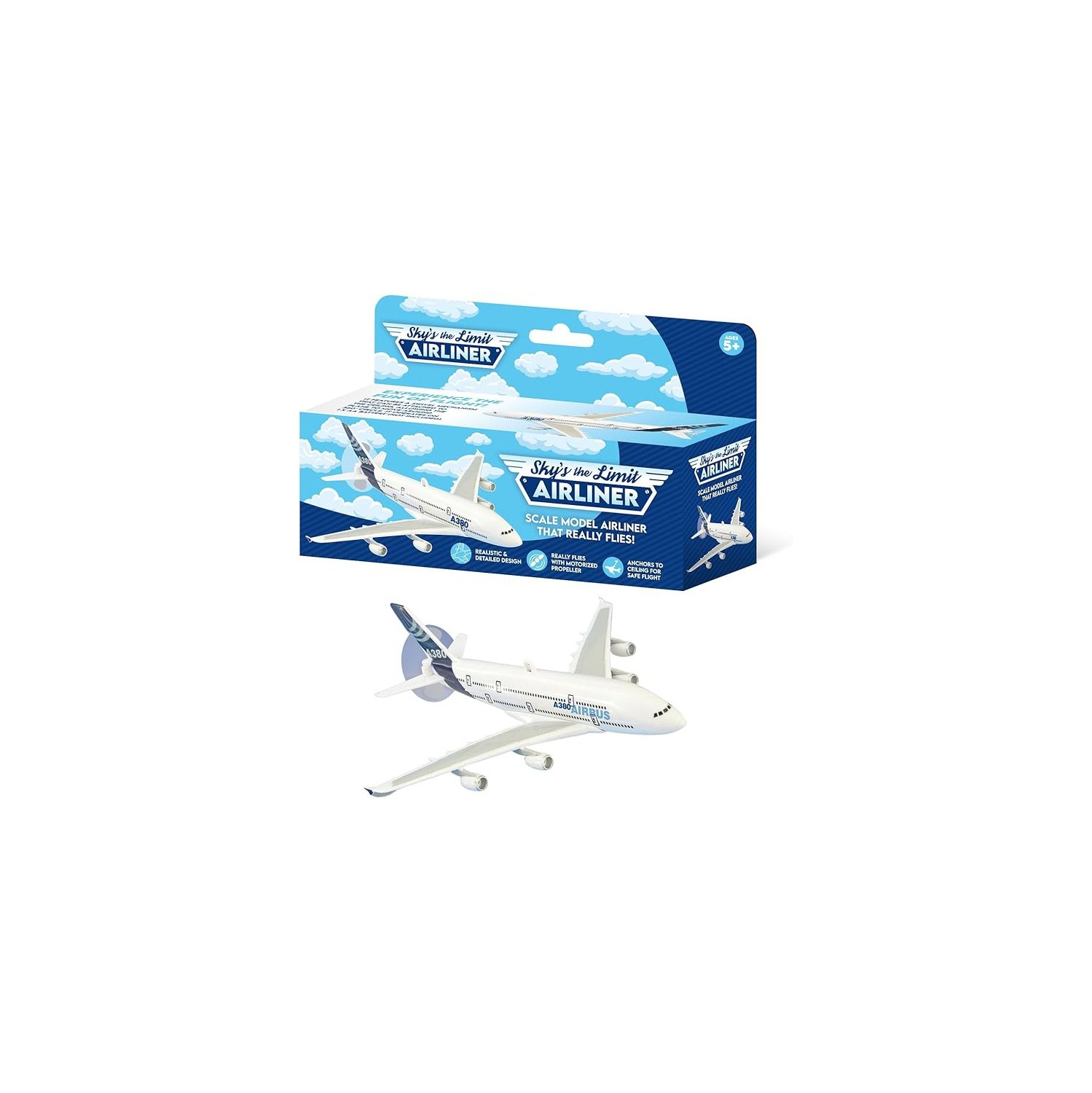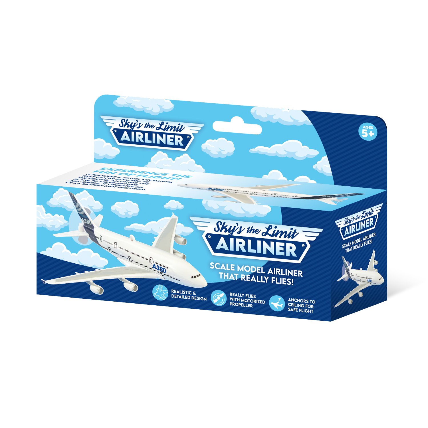 Lay down and watch the ceiling as this hanging scale model of an Airbus A380 Airliner Passenger Jet performs endless 360 degree circles above your head. With the included swivel ceiling anchor mechanism and a battery operated propeller on the rear, this jet takes flight and flys through the air on your ceiling. Nicely detailed to look like the real Airbus. Sold in a fully illustrated retail box that is pegable and shelf able. Bilingual Packaging. For ages 5+. Master case is 24pcs.