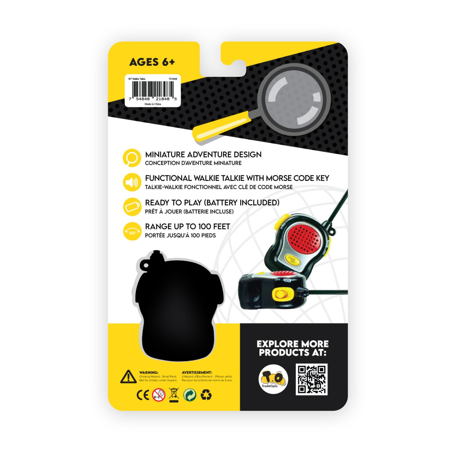 Introducing the World’s Tiniest Walkie Talkies – compact communication wonders that fit in the palm of your hand. These mini marvels bring big fun and functionality to your adventures, making every interaction an exciting connection. Up to 100 ‘ range. Each Tiny Walkie Talkie measures 4″ Tall. Includes four LR44/AG13 batteries per Walkie Talkie. Bilingual Packaging. Ages 6+. Master case is 12pcs.